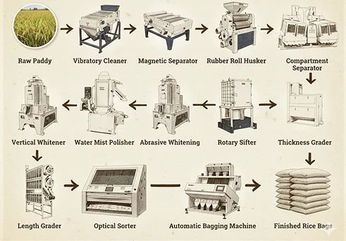 Modern milling, grading, and polishing machinery for efficient, high-quality rice processing.